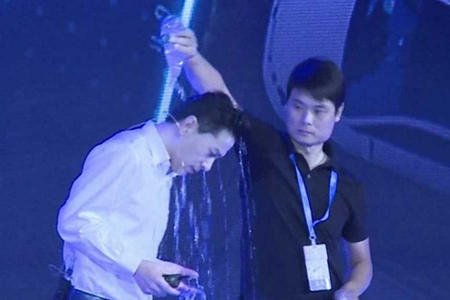 Robin Li, co-founder of the firm, was mid-presentation when a man walked on to the stage, grabbed his arm and emptied a bottle of water on his head, reports BBC.