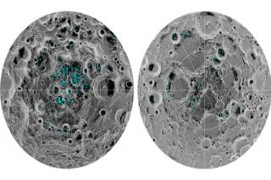 The distribution of the ice deposits is patchy. At the lunar south pole, most of the ice is concentrated in craters. At the northern pole, the water-ice is both more sparse and more widely spread.