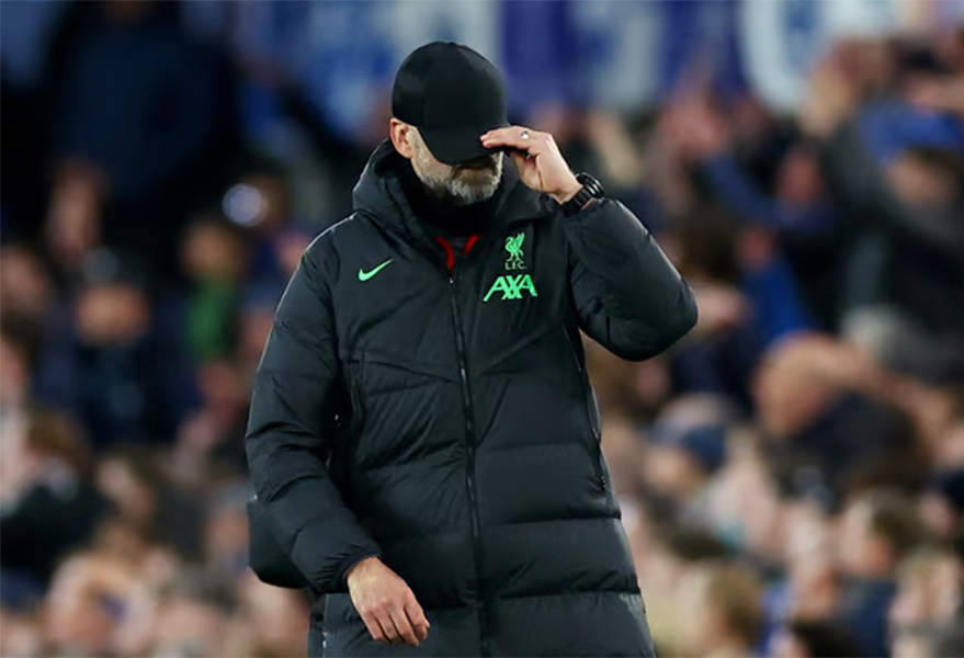 Liverpool manager Juergen Klopp apologised to fans after a 2-0 loss to Everton in the Merseyside derby that all but extinguished their faint hopes of winning the Premier League title.