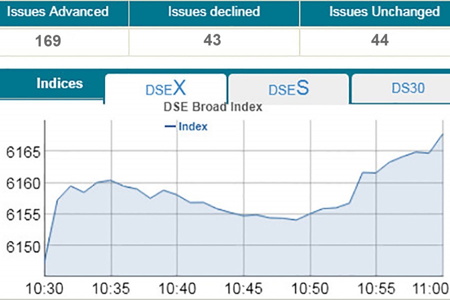 DSEX, the prime index of the DSE, went up by 34.97 points or 0.56 per cent to reach at 6,182 points at 11:00am.