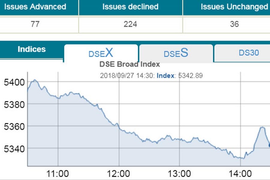 Finally, DSEX, the prime index of the Dhaka Stock Exchange (DSE), settled the week at 5,342, losing 47.96 points or 0.88 per cent over the previous day.
