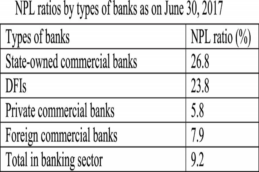 One critical element that has direct bearing on a bank's lending rates is the ratio of non-performing loans in their loan portfolio. Unfortunately, the ratio of non-performing loans has broken loose from its moorings on account of poor loan management, legal complications and dilatory process for recovery of dues from the recalcitrant borrowers. If we throw in this mix the money stolen by fly-by-night characters through loan scams, proportion of NPL would shoot further up the sky. According to the Bangladesh Bank's Annual Report for FY 2016-17, the following are the NPL ratios by types of banks on June 30, 2017.