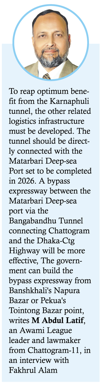 Ans: Yes, in my opinion, the Matarbari Deep-sea Port and the Bangabandhu Tunnel should be directly connected. The present plan of the government is to connect the Matarbari Deep-sea Port with the Ctg.-Cox's Bazar Highway (N1) through Chakaria's Fashikhali point via an approximately 26km link road. The problem with this link road plan is it doesn't reduce the distance and time for cargo vehicle movement from the Matarbari port to Chattogram or the Chattogram-Dhaka Highway. It will also create traffic congestions on the national highway. However, a connection with the national highway may be generally important as the government is expanding the Ctg-Cox N1. But from a commercial and business point of view it doesn't look like adding value as there is no net gain in distance.