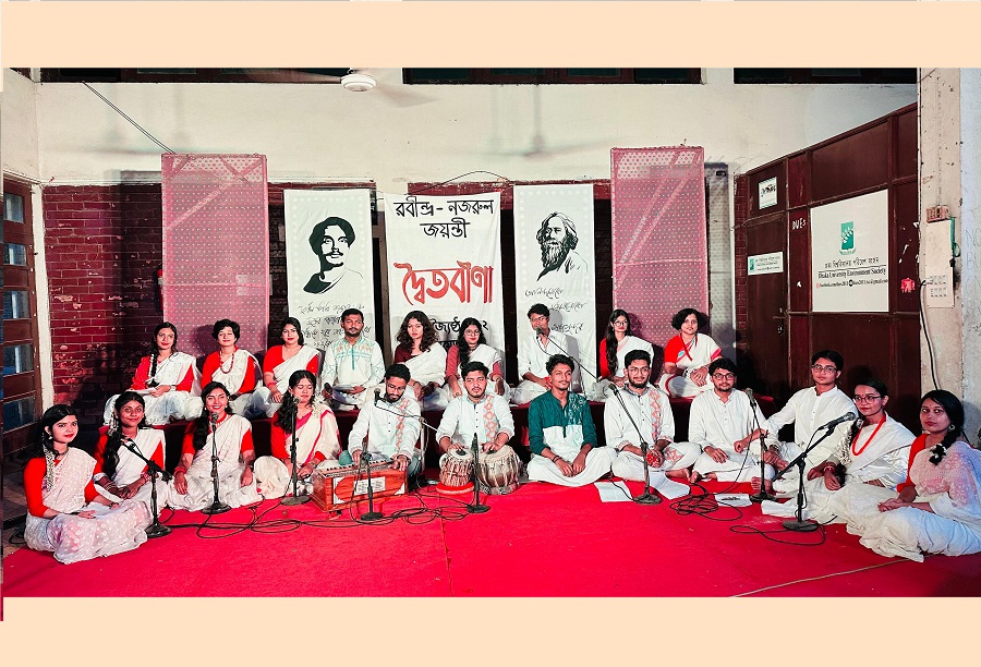উৎসবমুখর পরিবেশে বৃহস্পতিবার (২২ মে, ২০২৫) ঢাকা বিশ্ববিদ্যালয়ের টিএসসি প্রাঙ্গনে ঢাকা বিশ্ববিদ্যালয় সাংস্কৃতিক সংসদ কর্তৃক আয়োজিত হলো রবীন্দ্র-নজরুল জয়ন্তী "দ্বৈতবীণা।"