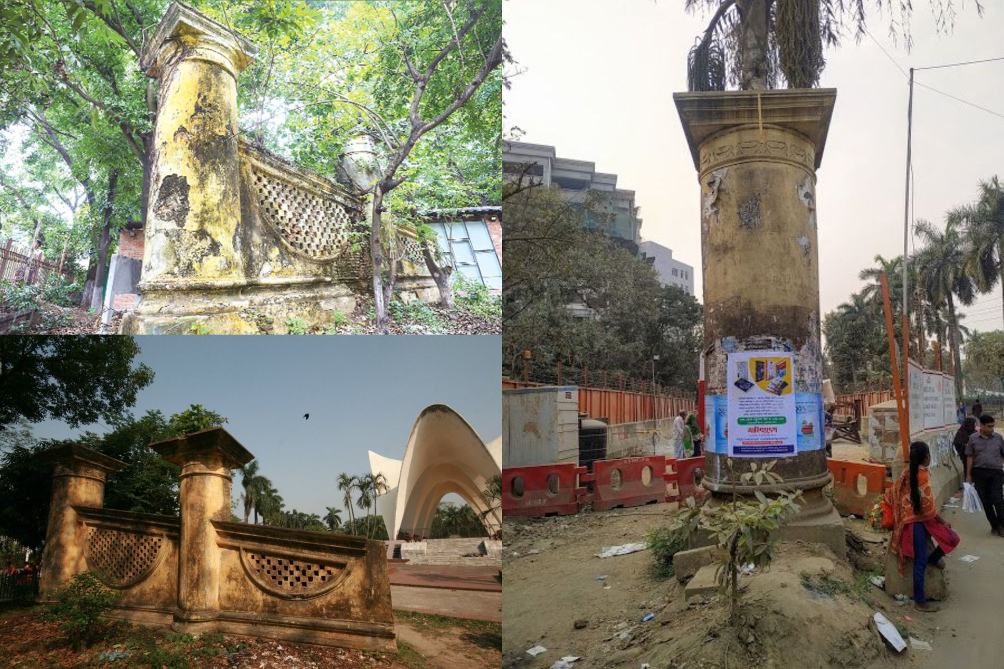 ঢাকা বিশ্ববিদ্যালয়ের কার্জন হলের সামনে দিয়ে সোহরাওয়ার্দী উদ্যান যাওয়ার পথে মেট্রোরেলের নিচে সড়কদ্বীপে চোখে পড়ে হলদে রঙের জীর্ণ শীর্ণ এক স্তম্ভ। বামে নবায়নযোগ্য শক্তি গবেষণা কেন্দ্রের পিছনের দিকে এই স্তম্ভের আরেকটি অংশ রয়েছে যার অবস্থা আরো করুণ। প্রায় ভঙ্গুর অবস্থায় দাঁড়িয়ে আছে গেটের মতো দেখতে এক স্থাপনা। আর ডান পাশে তিন নেতার মাজারের ভেতর পড়েছে এর আরেক অংশ। এটির অবস্থাও ভগ্নপ্রায়।