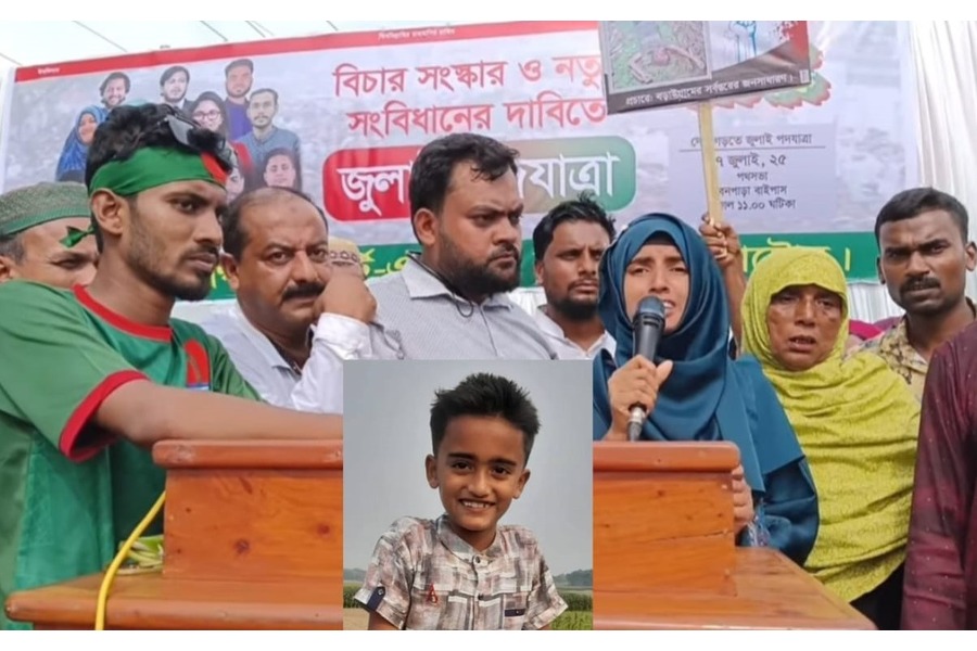 নাটোরের বড়াইগ্রামে জাতীয় নাগরিক পার্টি (এনসিপি) আয়োজিত জুলাই পদযাত্রার পথসভায় মঞ্চে এসে নিজ সন্তান আবীর হত্যার বিচার দাবি করলেন তার মা আঁখি খাতুন ও বাবা মিলন হোসেন। সোমবার বিকেলে বনপাড়া কালিকাপুর বাইপাস এলাকায় আয়োজিত এ কর্মসূচিতে আবীরের পরিবারের সঙ্গে শতাধিক এলাকাবাসীও উপস্থিত ছিলেন।