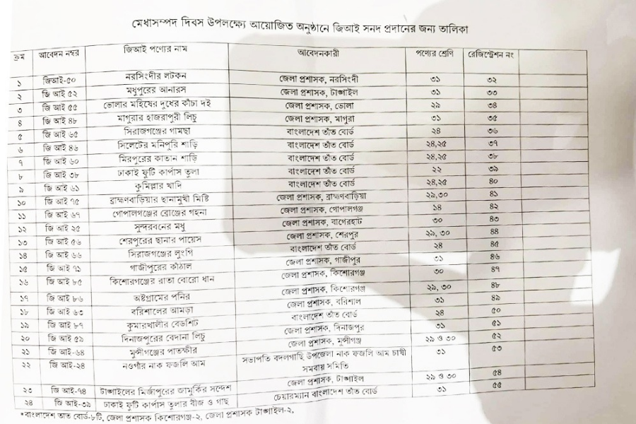 নতুন করে আরও ২৪টি দেশীয় পণ্য ভৌগোলিক নির্দেশক (জিআই) সনদ পেয়েছে।