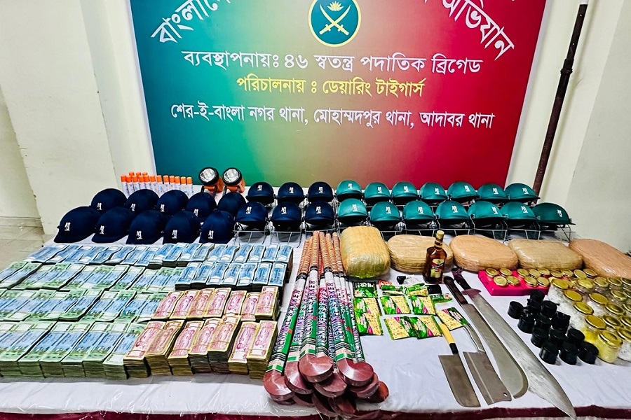 অভিযান চলাকালে উদ্ধার করা সামগ্রীর মধ্যে রয়েছে ১৩টি তাজা ককটেল, ২৫টি আধা প্রস্তুত ককটেল, ৪০০ গ্রাম গানপাউডার, ২টি সামুরাই তলোয়ার, ১২টি হকিস্টিক, ২৯টি হেলমেট, ২টি ড্রাগন লাইট, ১১ কেজি গাঁজা, ১২ প্যাকেট হেরোইন, টাকা গণনার মেশিন এবং নগদ ১ কোটি ১৩ লক্ষ টাকা।