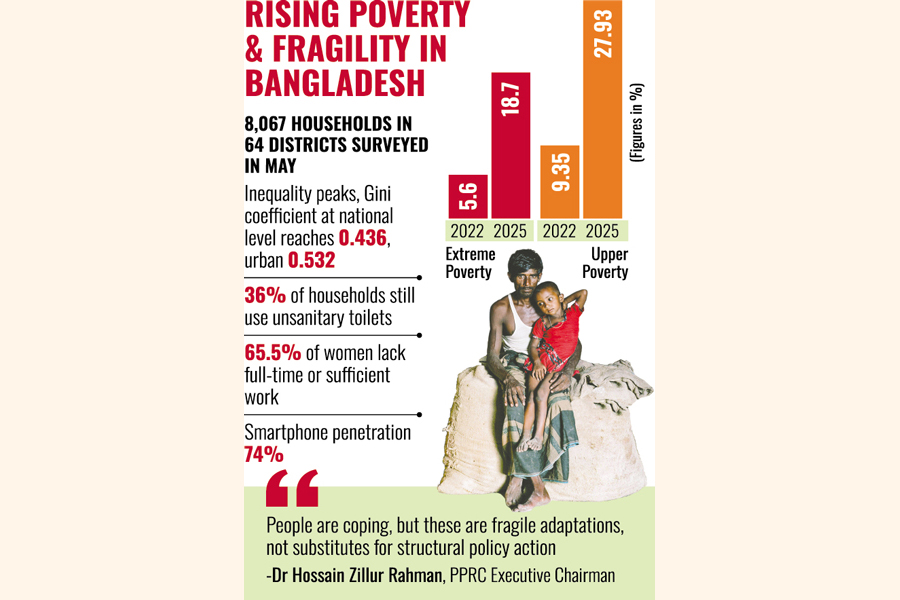 Poverty in Bangladesh has risen alarmingly, with more than one in four citizens now living below the poverty line and inequality reaching its steepest level in decades, according to a national survey released by the Power and Participation Research Centre (PPRC) on Monday.