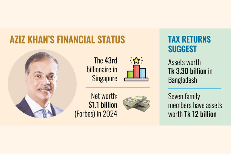 Taxmen's initial finding reveals that Aziz Khan, rated as the 43rd billionaire Singapore, has Tk 3.30 billion worth of assets in Bangladesh, which accounts only for 2.52 per cent, or a tiny part, of what he has amassed in Singapore.