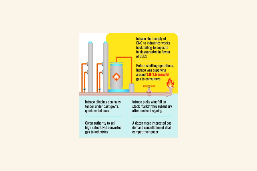 Intraco clinched the deal to supply CNG from Bhola - a bay island district some 282 kilometres off the capital - under the controversial Quick Enhancement of Electricity and Energy Supply (Special Provision) Act 2010 (Amended 2021).