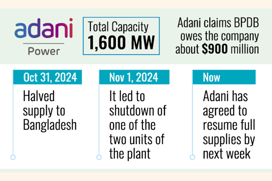 Ahead of summer demand and on Bangladesh Power Development Board's (BPDB) request, Adani Power has agreed to resume full supplies by next week, said the two sources who had direct knowledge of the matter but declined to be named as they were not authorised to talk to the media. The plant in eastern India sells only to Bangladesh.