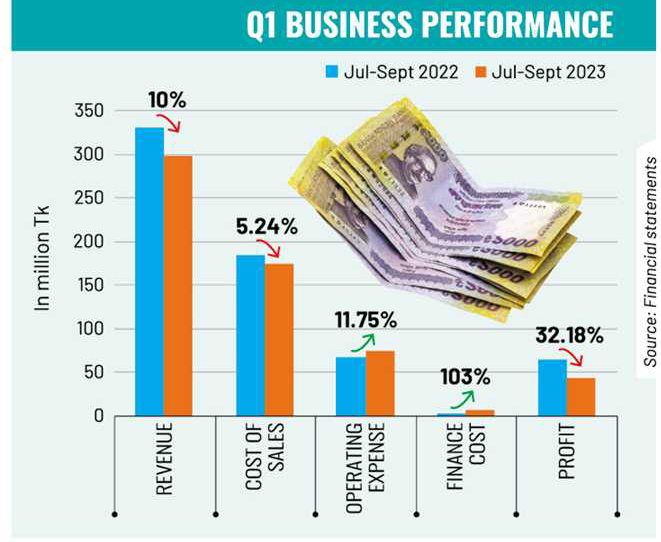 Revenue also declined 10 per cent to Tk 298.68 million in July-September this year, according to its quarterly financial statements published on Tuesday.