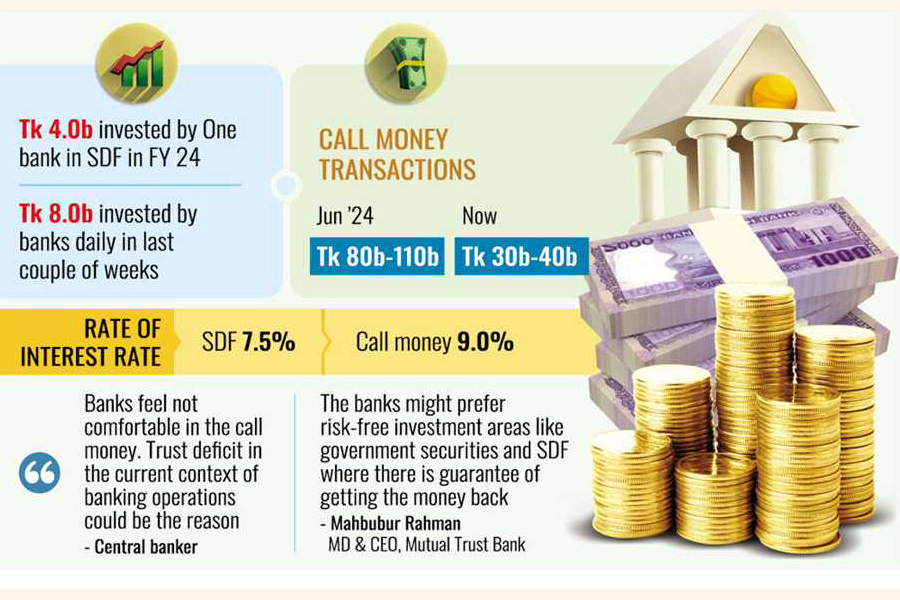 Officials and bankers have said despite higher bets offered on the call-money market, the lenders feel comfortable to put their un-invested money in the Standing Deposit Facility (SDF) or reverse repo of Bangladesh Bank (BB), where the rate is quite low.