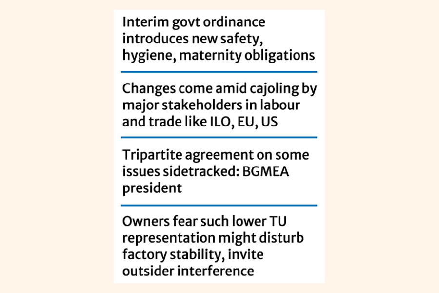 Asked about the sweeping changes on the industrial front, Bangladesh Garment Manufacturers and Exporters Association (BGMEA) president Mahmud Hasan Khan says they have objections regarding trade-union- registration requirement, definition of worker and provident fund.