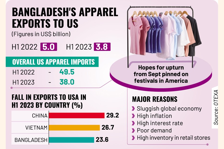Bangladesh's apparel export to the United States ebbed down during the first half of this year apparently as global economic slowdown, high inflation and rising interest rates dampened consumer demand.
