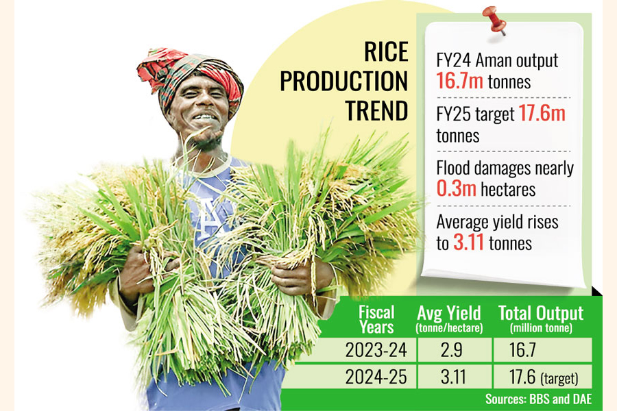 The country produced an all-time high of 16.7-million tonnes of rice in the last Aman season when average yield was 2.90 tonnes per hectare.