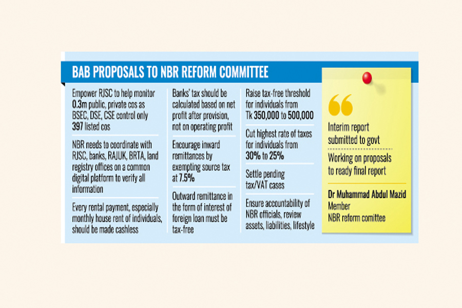 BAB Chairman Abdul Hai Sarkar has sent the proposals following request from Dr Muhammad Abdul Mazid, member of the advisory committee on reform in the NBR, also former chairman of the NBR.