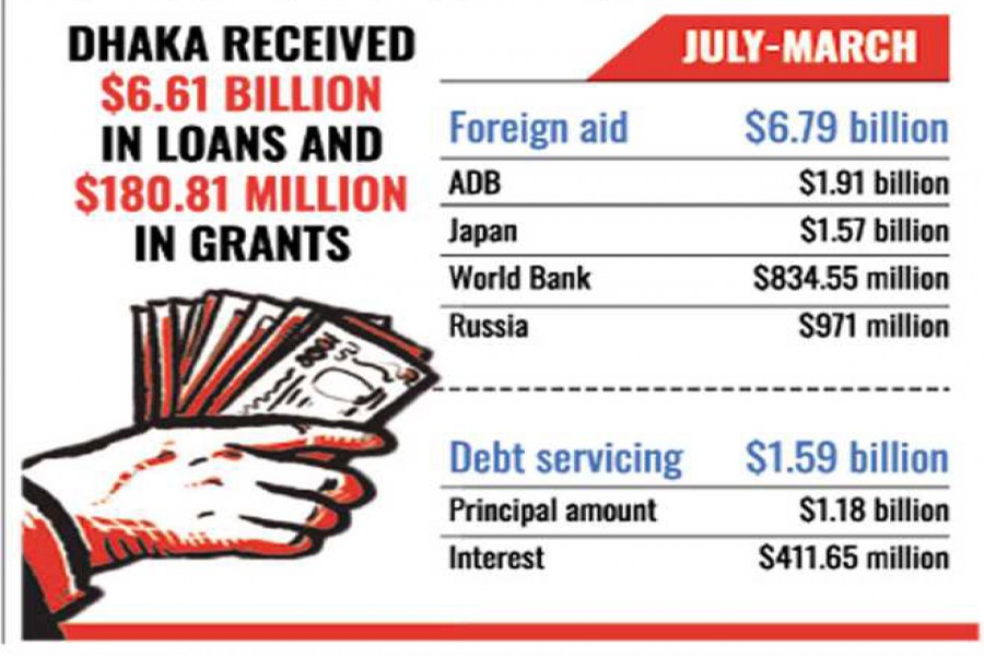 Out of the aid disbursed so far in the current fiscal, Dhaka received $6.61 billion in loans and $180.81 million in grants.