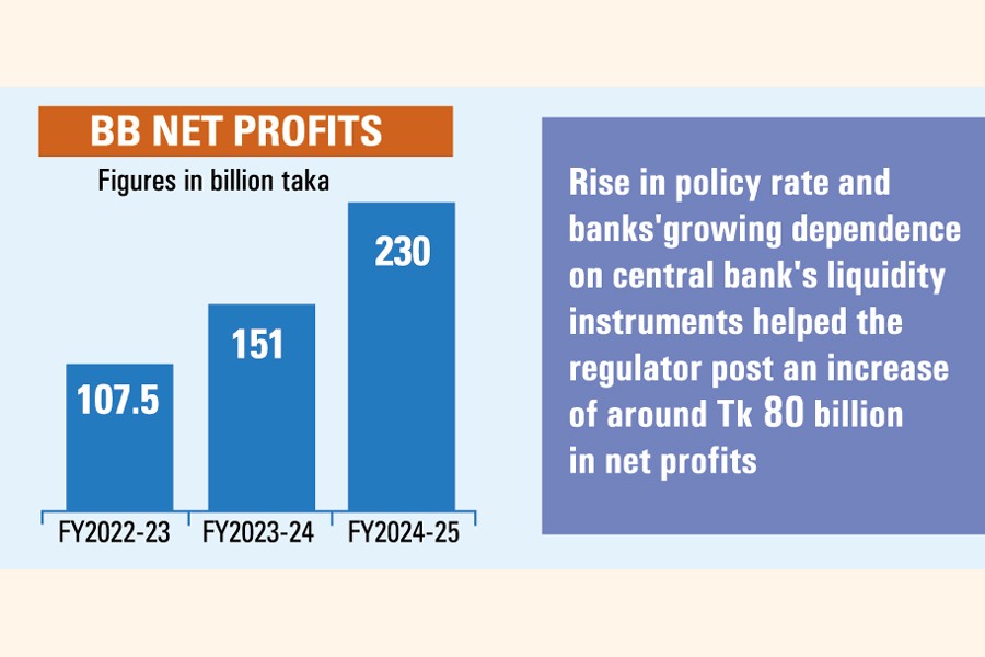 Data shows the banking regulator made net profits of around Tk 230 billion in FY25, an increase of 52 per cent from Tk 151 billion recorded in the previous fiscal year.
