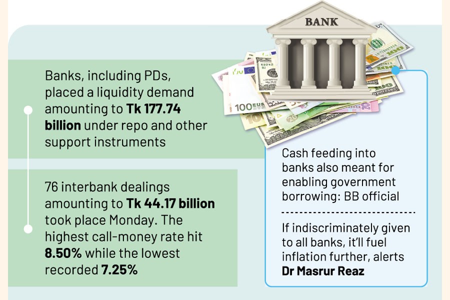 Another BB official, preferring to be anonymous, said the banks, including the primary dealers, placed a liquidity demand amounting to Tk 177.74 billion under repo, standing lending facility, liquidity-support facility and IBLF at the auction held Sunday. "And the auction committee accepted all of their bids," the official said.