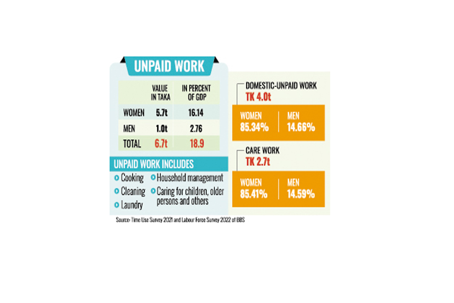 Besides, care work is worth Tk 2.7 trillion, with women having contributed 85.41 per cent of the total Tk 6.7 trillion worth of economic value.