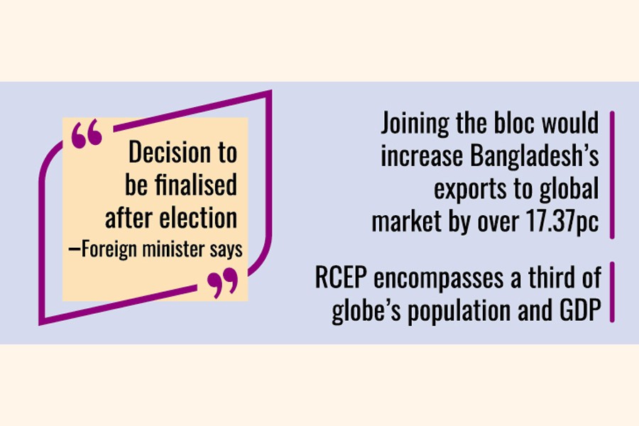Bangladesh will not join the Regional Comprehensive Economic Partnership (RCEP), world's largest regional free-trade bloc led by China, or any other grouping before the forthcoming general election.