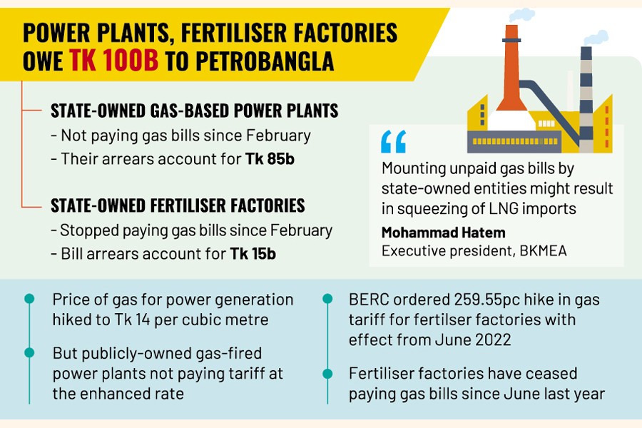 Power plants and fertilizer factories in public sector owe around Tk 100 billion, equivalent to US$926 million, to Petrobangla against gas purchases, Petrobangla chairman Zanendra Nath Sarker told the FE Tuesday.