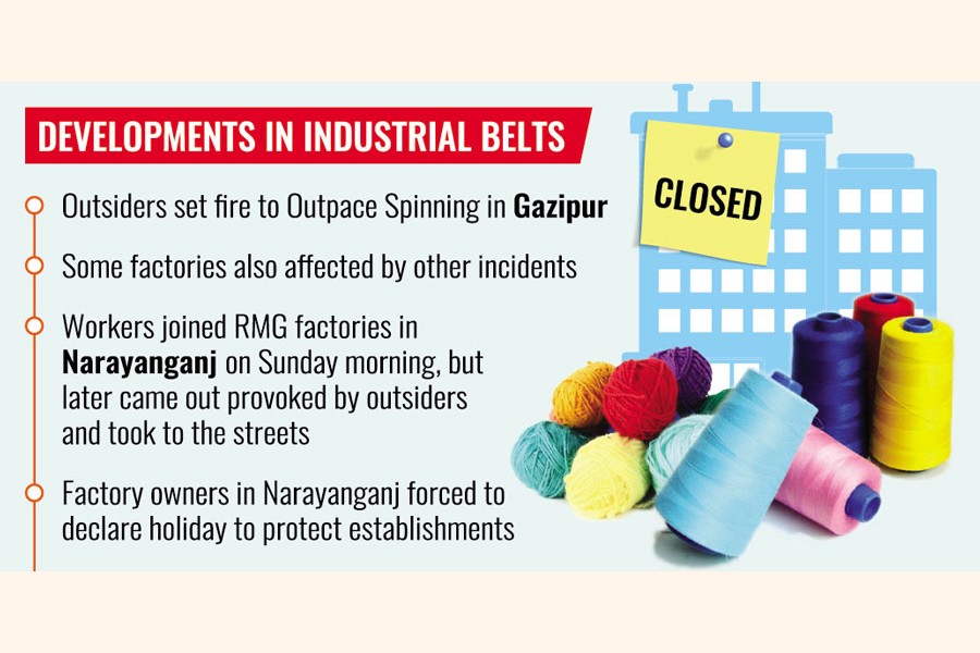 Following them, workers of several other factories located at Narayanganj BSCIC and Fatullah came out, prompting other factory owners to declare a holiday to protect their establishments, said Bangladesh Knitwear Manufacturers and Exporters Association (BKMEA) Vice President Fazle Shamim Ehsan.