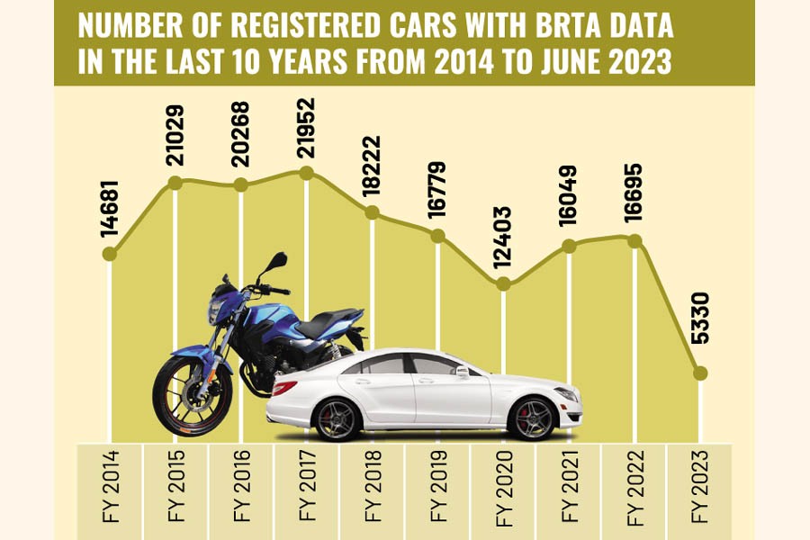 The BRTA data showed that 5,330 cars were registered in the first six months of the current calendar year, down from 9,394 in the same period last year.