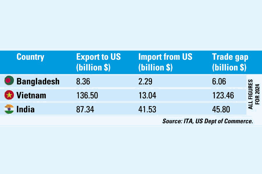 Analysing the US government's trade data, The Financial Express found that compared to Bangladesh, America's trade deficit with Vietnam was more than 20 times higher and with India 7.5 times greater in 2024.