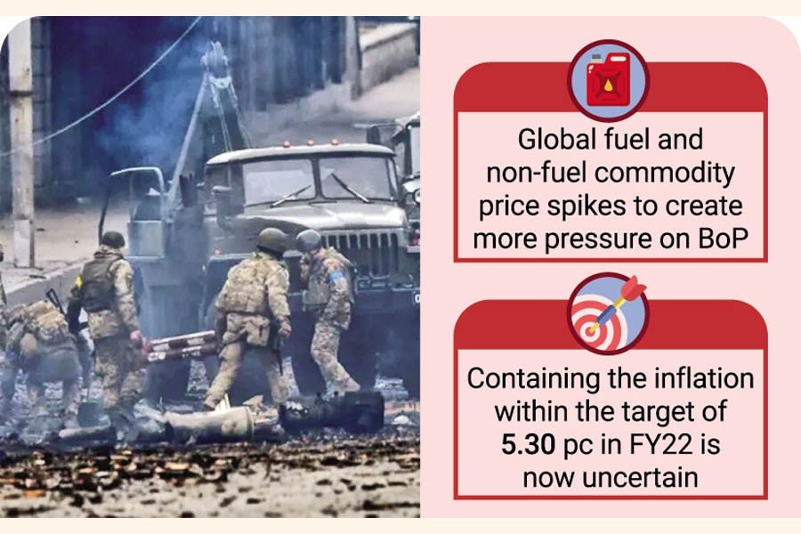 Fallouts from the Russia-Ukraine war and global commodity-price spiral may stymie Bangladesh's economic growth and also fuel inflation by this fiscal yearend, the central bank forewarns.