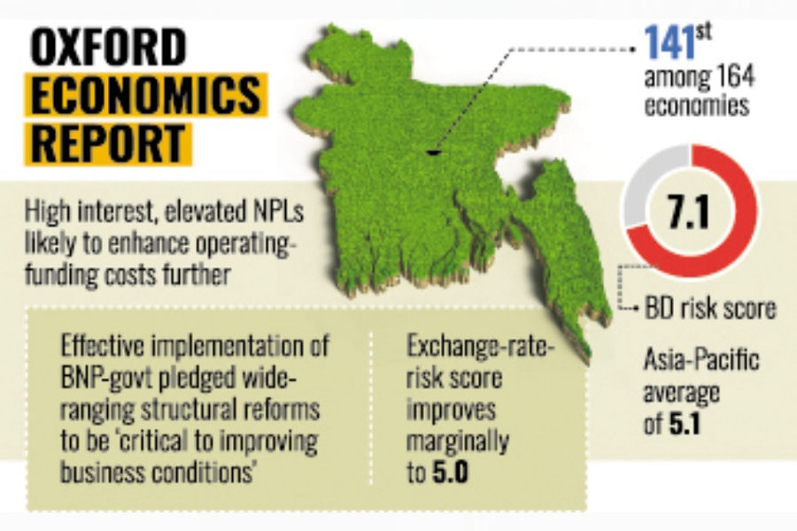 In latest ratings by Oxford Economics, Bangladesh has ranked 141st out of 164 economies, with an overall economic risk score of 7.1, well above the Asia-Pacific average of 5.1.