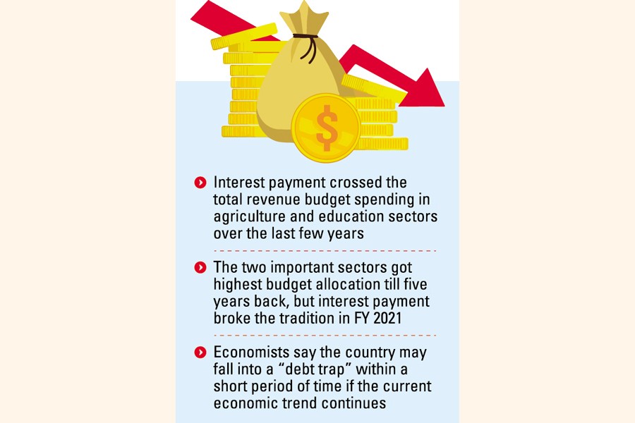 Although the country's very important two sectors - agriculture and education--had got highest allocation from the revenue budget till five years back in FY2020, the interest payment has broken the tradition in the fiscal year (FY) 2021, the data showed.