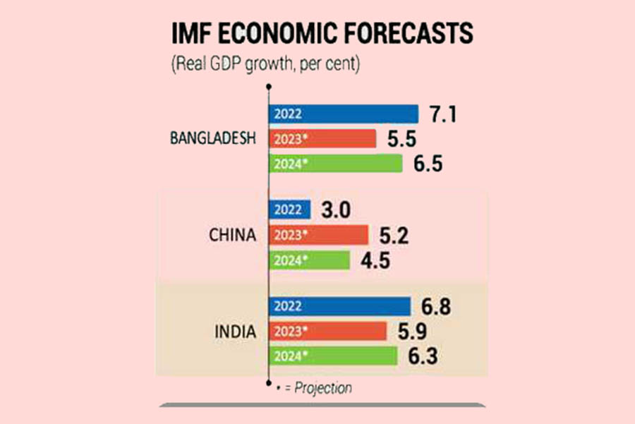 According to the IMF, Bangladesh’s economy may grow at a 6.5-percent rate in the next fiscal year (FY) 2023-24 while the Chinese economy at 4.5 per cent and India at 6.3 per cent.