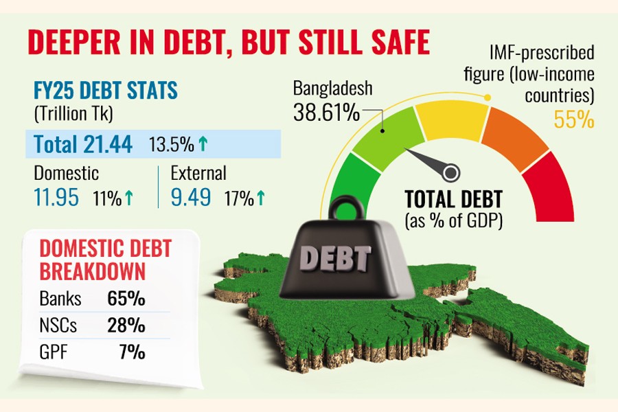 Bangladesh's total debt rose by more than 13.5 per cent to Tk 21.44 trillion in the fiscal year ending in June 2025, driven largely by external borrowing, according to data released by the Finance Division on Wednesday.