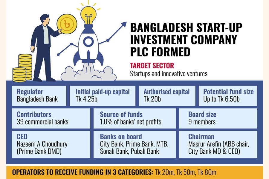 Seeking anonymity, a BB official said the long-awaited public limited company, Bangladesh Start-up Investment Company PLC, has finally been formed with an initial fund of Tk 4.25 billion contributed by 39 commercial lenders.