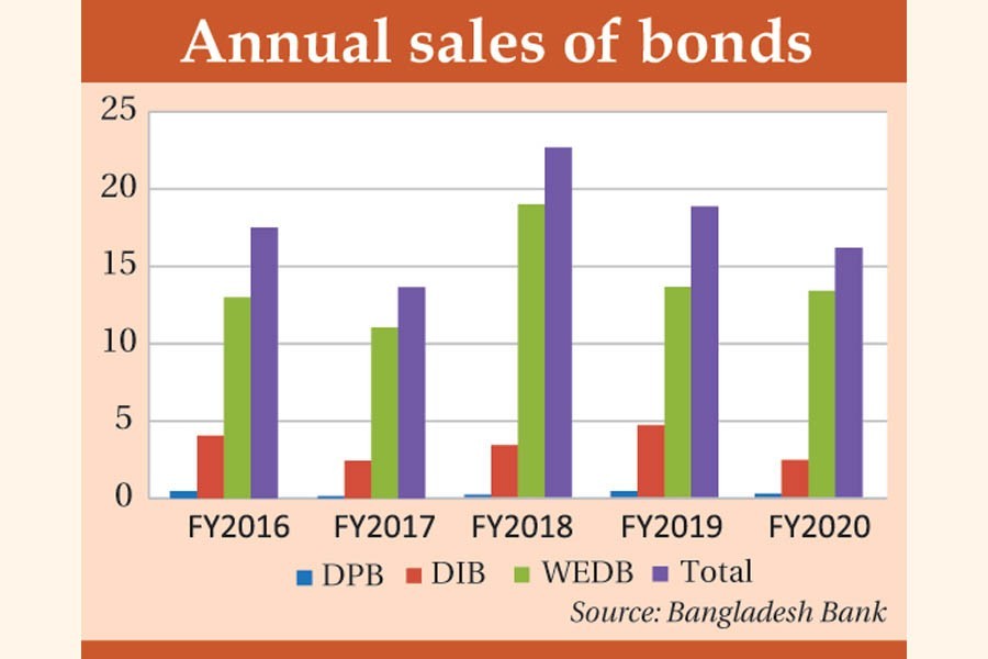 Out of the total sales in last FY2020, the banks sold WEDB worth Tk 13.41 billion, DIB worth Tk 2.49 billion and DIP worth Tk 300 million, the BB statistics showed.