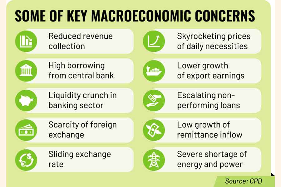 The CPD executive director also mentions lower growth in revenue mobilisation and consequent shrinking of fiscal space, over-dependence on bank borrowing to finance budget deficits, high prices of essentials, depreciating external-sector balance and foreign-exchange reserves as very visible signs of macroeconomic stress.