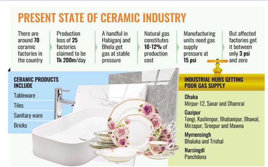 The country's ceramic manufacturing factories in key areas like Dhaka, Gazipur and Narsingdi have been struggling to continue production as they have been suffering from a severe gas crisis in recent times.