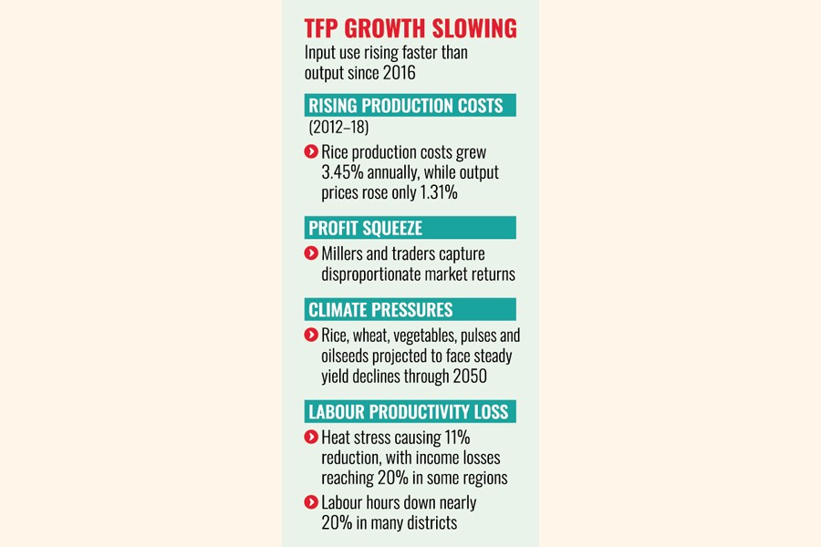 A new study by the Bangladesh Institute of Development Studies (BIDS) warns that the country's agrifood system, employing nearly half of the labour force, is increasingly constrained by slowing yield improvements and diminishing returns from intensive input use.