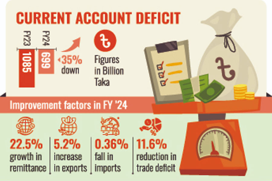 Bangladesh's current- account deficit under the balance of payments narrowed to Tk 698.81 billion at the end of FY24, a significant improvement from the Tk 1.085-trillion deficit recorded in the previous financial year.