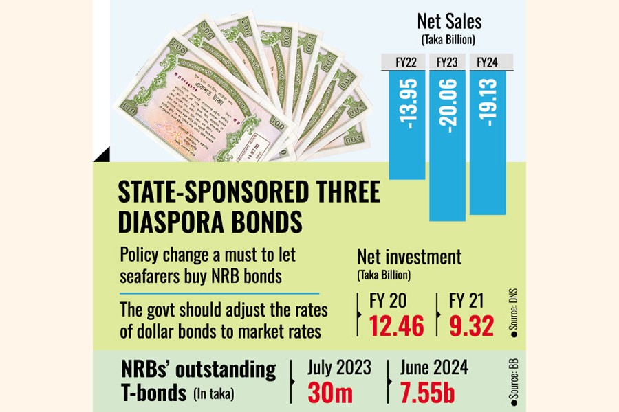 The gross sales of the NRB (non-resident Bangladeshi) bonds were Tk 11.06 billion in FY24, Tk 11.72 billion in FY23 and Tk 9.83 billion in FY22.