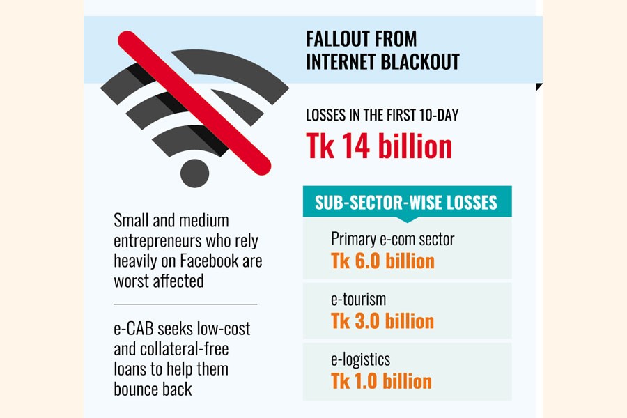 The e-Commerce Association of Bangladesh (e-CAB) has reported a walloping great financial loss in the country's e-commerce sector due to the recent shutdown of internet and social network Facebook.