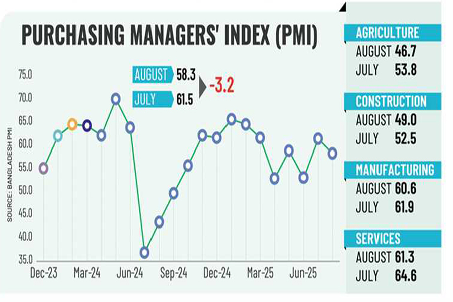 The PMI - jointly prepared by the Metropolitan Chamber of Commerce and Industry, and Policy Exchange Bangladesh - stood at 58.3 in August, down 3.2 points from July's reading.