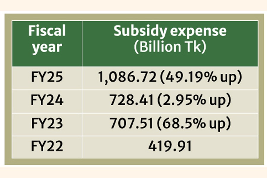 The government spent Tk 1,086.72 billion on subsidies in the fiscal year 2024-25, 49.19 per cent higher than that in FY24, official statistics show.
