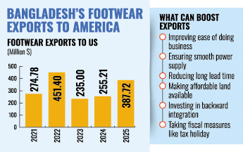 In the last calendar year, Bangladesh exported footwear worth $387.72 million, compared to $255.21 million in 2024, according to OTEXA, an affiliate of the US Department of Commerce.