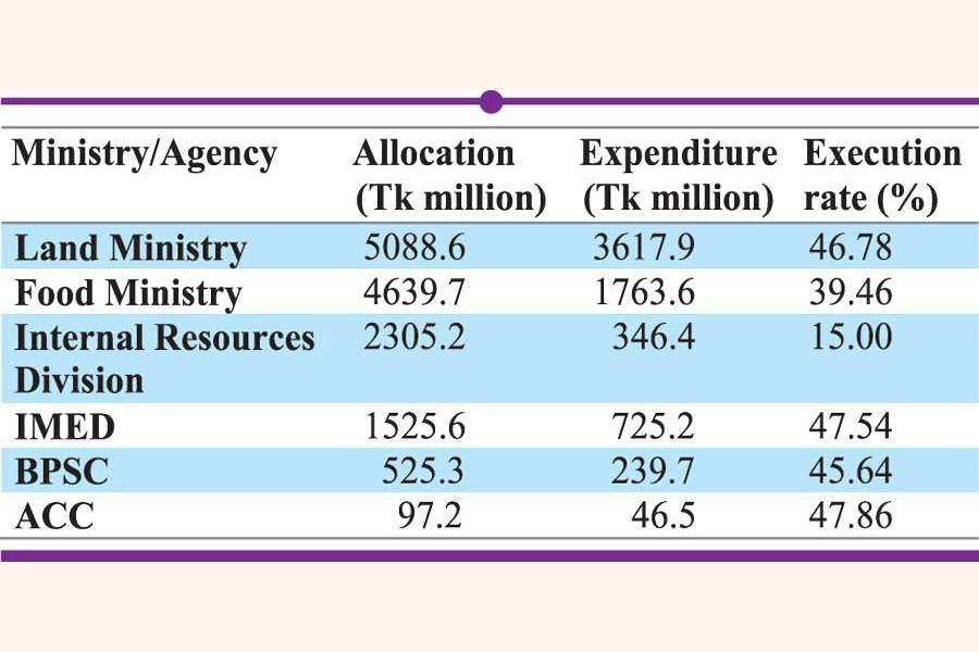The ministries and agencies, which had failed to implement even half of their development work during FY2020, include Bangladesh Public Service Commission, the ministry of land, the Anti-Corruption Commission and the IMED, the agency tasked with tracking the performance of other government organs.