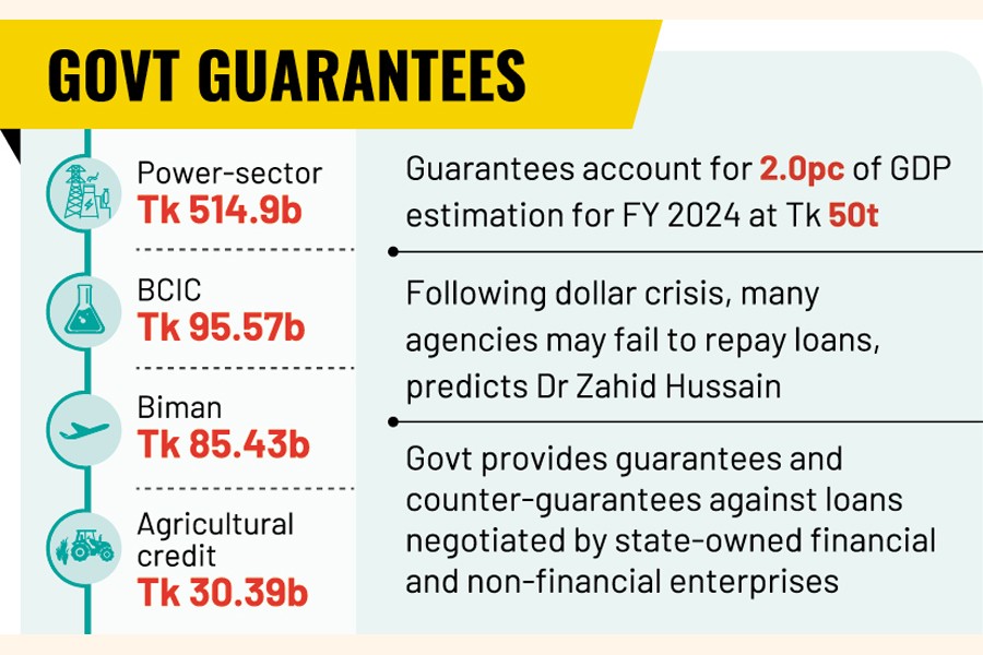 Accounting for around 2.0 per cent of the GDP (GDP estimation for FY 2024 is now Tk 50 trillion), the guarantees are a matter of concern as the repayment liabilities will pass on to the government exchequer when government agencies will fail to repay the loans in time, and consequently, have future fiscal implications for the nation, analysts opine.