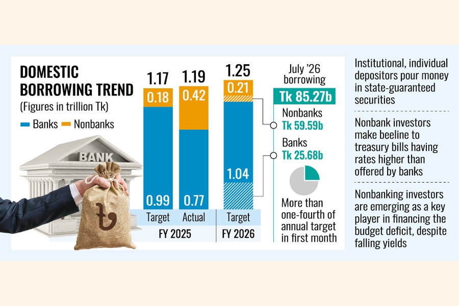 In the current national budget for FY'26, the target of total domestic borrowing has been set at Tk 1.25 trillion, Tk 1.04 trillion of which planned to be borrowed from the banking system while Tk 210 billion from the nonbanking sources.